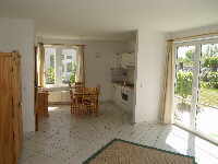 Gemütliches Wohnzimmer mit Fernseher und 140 cm breiter Bettcouch, Ausgang zur Terrasse, im Vordergrund der Esstisch